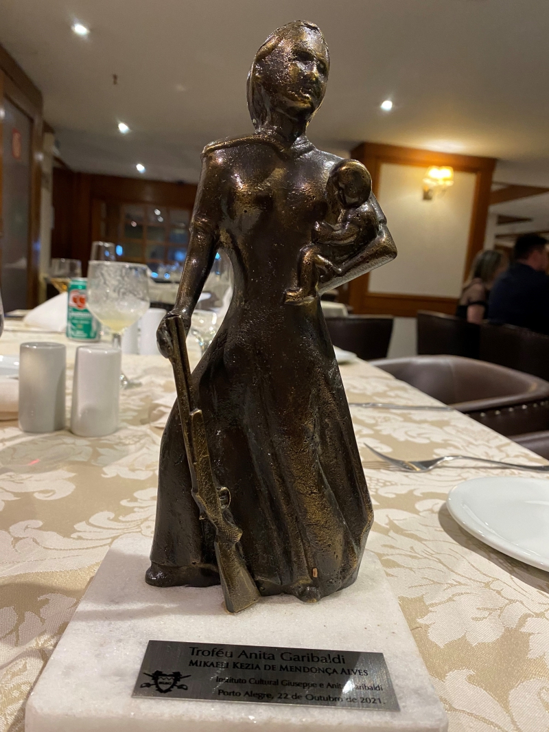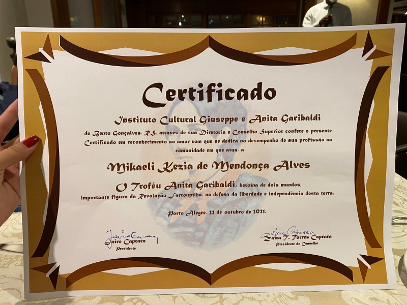 A Dra. Mikaeli Kezia de Mendonça Alves, recebeu no dia 22/10/2021, na cidade de Porto Alegre, o troféu ANITA GARIBALDI - uma homenagem pelo Instituto cultural Joseph e Anitta Garibaldi, em reconhecimento no amor com que se dedica ao desempenho de sua profissão, na comunidade em que atua, e aos relevantes serviços prestados a sociedade Brasileira.
