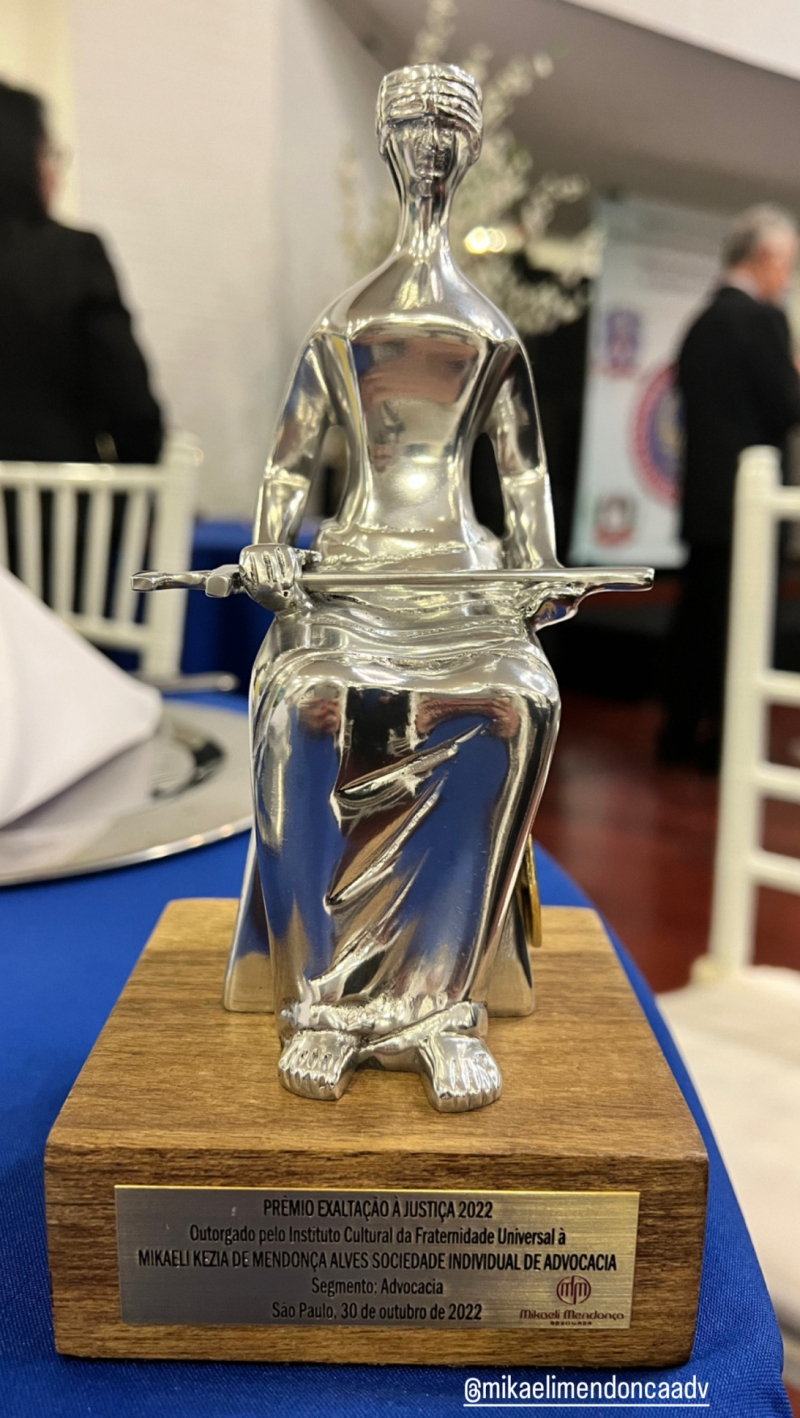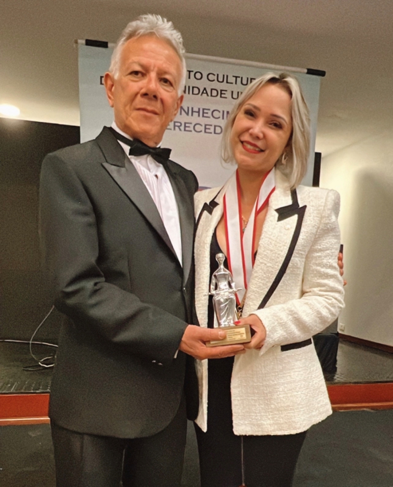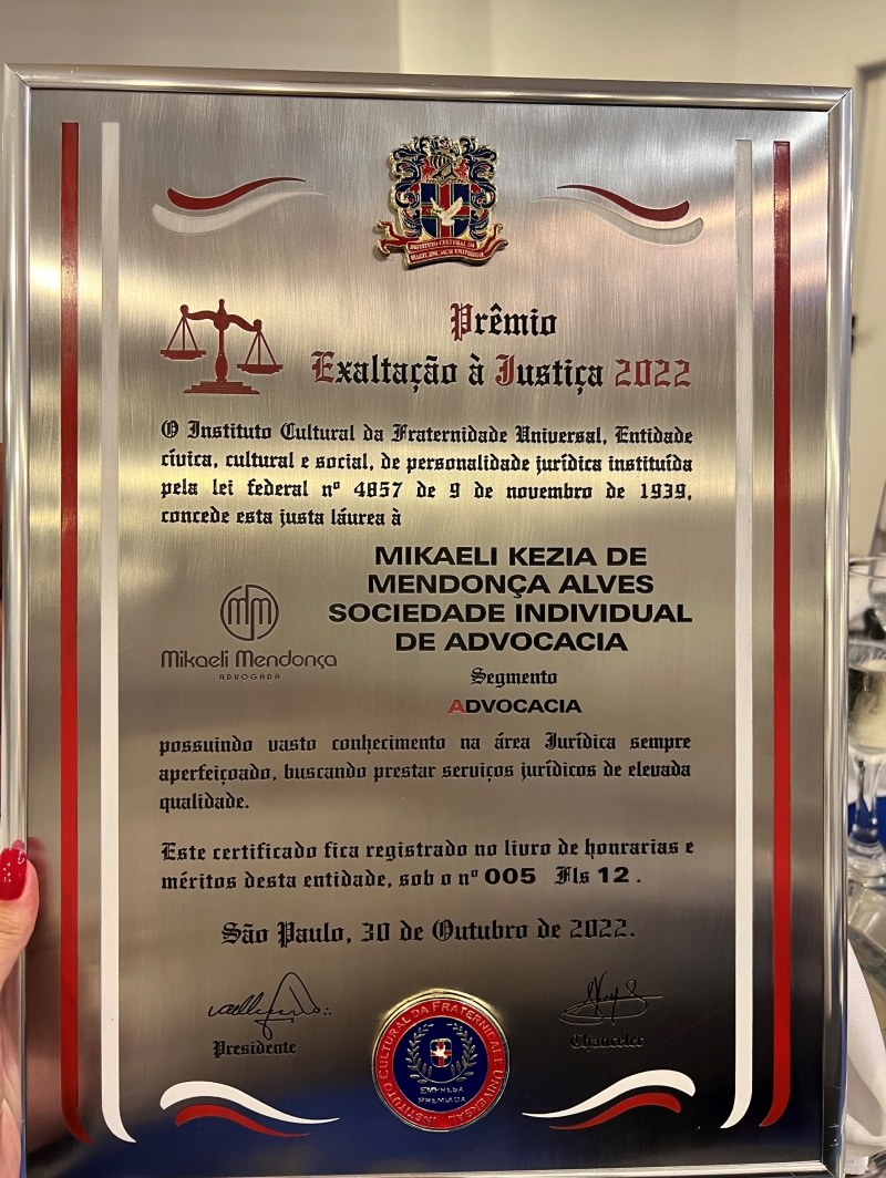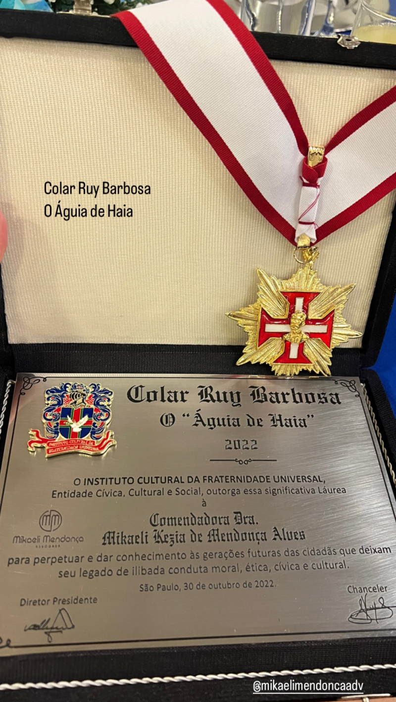 O Instituto Cultural da Fraternidade Universal homenageia a Dria Mikaeli Mendonça com o Prêmio Exaltação à Justiça 2022 E Medalha Ruy Barbosa, em evendo realizado em 31/13/22.