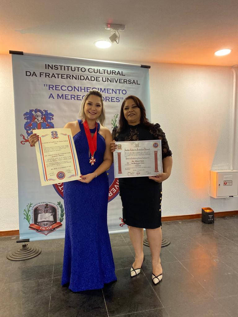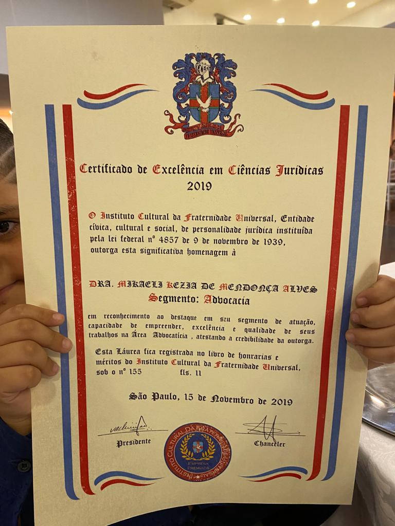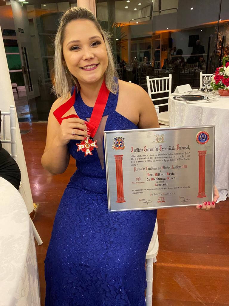 Em NOVEMBRO DE 2020 na cidade de São Paulo o INSTITUTO CULTURAL DA FRATERNIDADE UNIVERSAL premiou a DRA. MIKAELI KEZIA DE MENDONÇA ALVES, com o prêmio EXCELÊNCIA EM CIÊNCIAS JURÍDICAS 2020, que recebeu o valioso Prêmio em reconhecimento ao trabalho desenvolvido em seu segmento, pautado na ética e competência, demonstrando a sua capacidade de empreender, contribuindo decisivamente para o crescimento e desenvolvimento do nosso País.