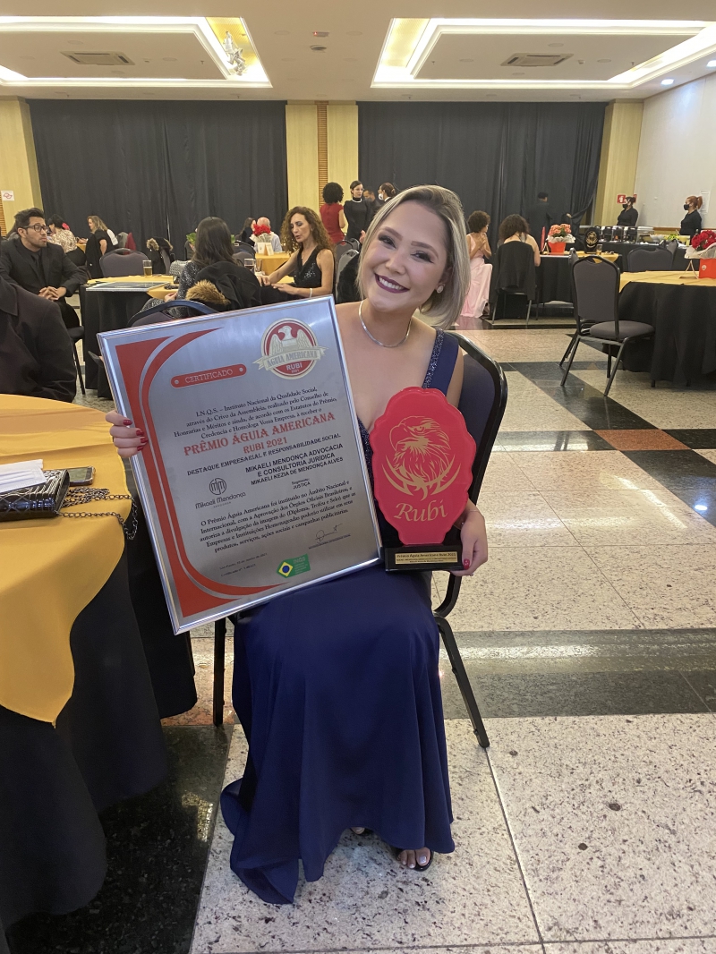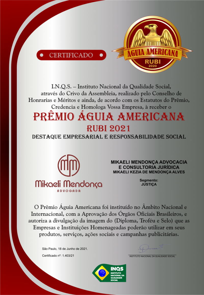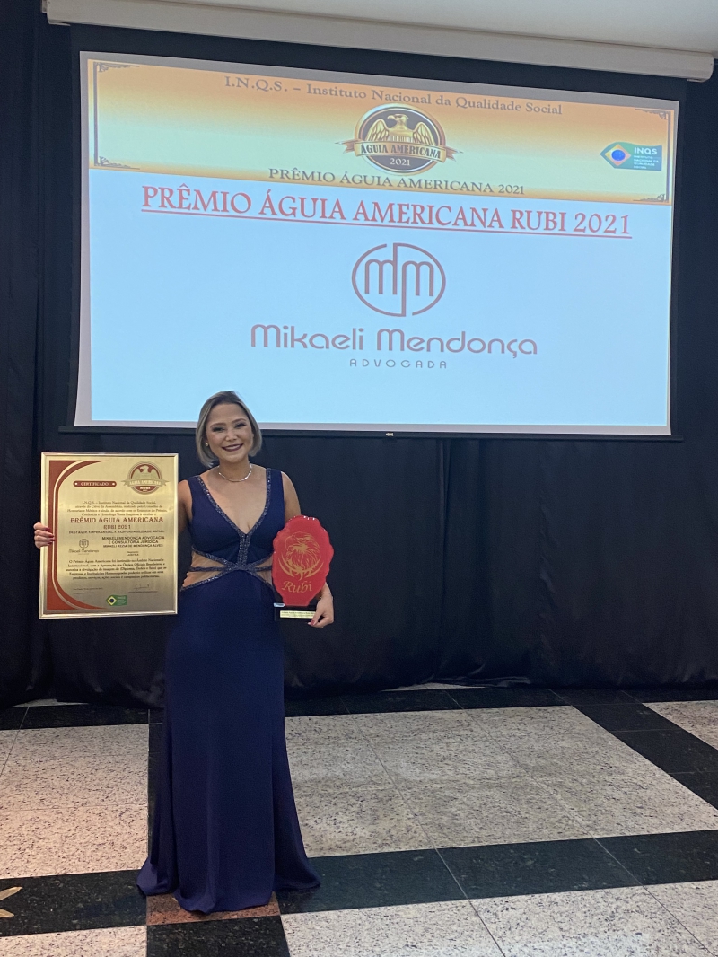 O Supremo Egrégio Conselho Nacional de Honrarias e Honorificências do Instituto I.N.Q.S, (instituto nacional da Qualidade Social), Qualificou a Dra. MIKAELI MENDONÇA ADVOCACIA E CONSULTORIA JURÍDICA, para o recebimento do Prêmio Águia Americana “Rubi”, como destaque no mundo empresarial, na solenidade de 18 de junho de 2021.
